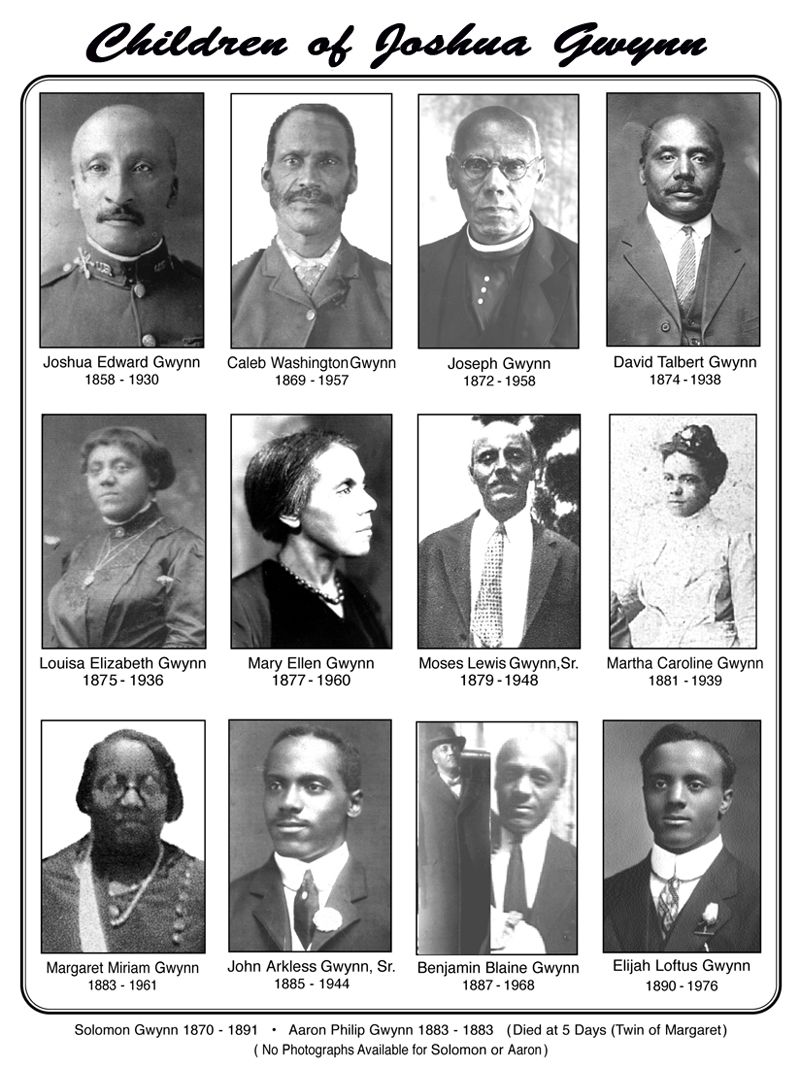 Ellen Booth Johnson (1826 - ) Margaret Jane Roberts Gwynn Mother of: Caleb Washington Gwynn (1869 - 1957) Solomon Gwynn (1870 - 1891) Joseph Gwynn (1872 - 1958) David Talbert Gwynn (1874 - 1938) Louisa Elizabeth Gwynn (1875 - 1936) Mary Ellen (or Eleanor) Gwynn (1877 - 1960) Moses Lewis Gwynn, Sr. (1879 -1948) Martha Caroline Gwynn (1881 -1939) Margaret Miriam Gwynn (1883 - 1961) Twin of Aaron Aaron (or Aron) Philip Gwynn (1883 -1883) Died at 5 days John Arkless Gwynn, Sr. (1885 - 1944) Benjamin Blane (or Blaine) Gwynn (1887 - 1968) Elijah Loftus Gwynn (1890 - 1976)